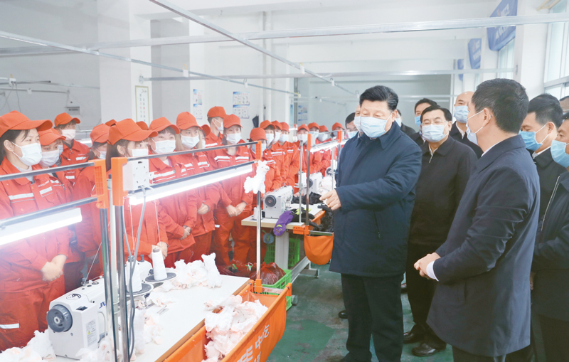 2020年4月20日至23日,中共中央總書記、國家主席、中央軍委主席習近平在陜西考察。這是4月21日,習近平在安康市平利縣老縣鎮錦屏社區考察社區毛絨玩具廠,了解搬遷群眾就業情況。 新華社記者 鞠鵬/攝