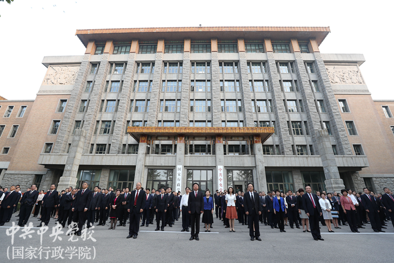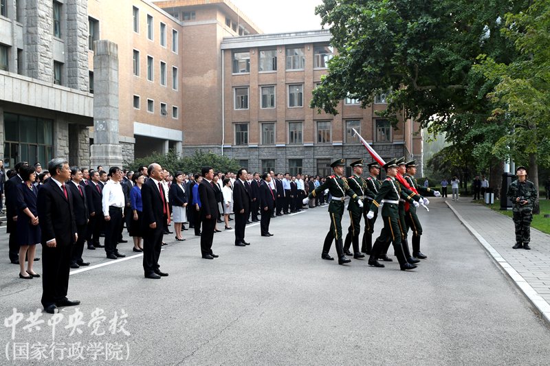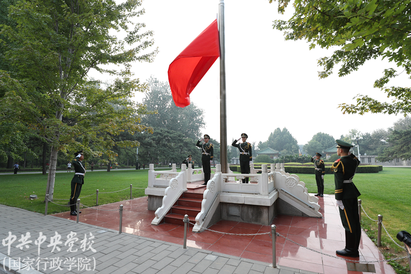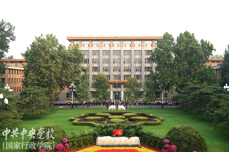 為營造慶祝中華人民共和國成立70周年濃厚氛圍,深入推進“我和我的祖國”群眾性主題宣傳教育活動,9月30日早晨,中央黨校(國家行政學(xué)院)舉行了莊嚴的“迎國慶”升國旗儀式,慶祝新中國70華誕。中央黨校(國家行政學(xué)院)分管日常工作的副校(院)長何毅亭,副校(院)長王東京、甄占民、李季、謝春濤出席升國旗儀式。副教育長、副秘書長,各直屬單位領(lǐng)導(dǎo)班子成員,部分教職工代表和學(xué)員代表,約500人參加了儀式。