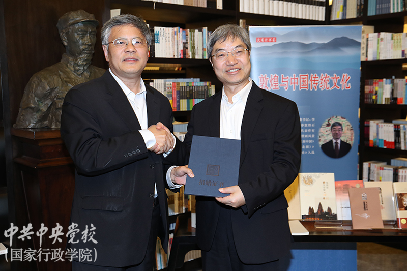 中央黨校(國(guó)家行政學(xué)院)副校(院)長(zhǎng)謝春濤對(duì)講座作了點(diǎn)評(píng)講話。他說(shuō),趙聲良院長(zhǎng)對(duì)敦煌文化深入淺出的解讀,讓我們深入理解到敦煌文化是具有包容性的文化、是體現(xiàn)本土性的文化、是富有創(chuàng)造性的文化。講座講的是敦煌文化,但不拘于敦煌文化,通過(guò)對(duì)敦煌文化的了解,使我們對(duì)習(xí)近平總書(shū)記關(guān)于弘揚(yáng)中國(guó)傳統(tǒng)文化、堅(jiān)定文化自信的一系列重要論述有了更加深刻的理解。敦煌文化的輝煌歷史告訴我們,中華民族創(chuàng)造了源遠(yuǎn)流長(zhǎng)的中華文化,只要我們堅(jiān)定文化自信,善于繼承中國(guó)傳統(tǒng)的優(yōu)秀文化,善于吸收外來(lái)的先進(jìn)文化,善于立足偉大實(shí)踐,在借鑒中創(chuàng)新、在繼承中發(fā)展,中華民族就一定能夠創(chuàng)造中華文化新的輝煌。謝春濤代表中央黨校(國(guó)家行政學(xué)院)接受了趙聲良贈(zèng)送的《敦煌石窟藝術(shù)簡(jiǎn)史》《敦煌藝術(shù)十講》《莫高窟與吳哥窟的對(duì)話》《甘肅石窟志》等一批著作,共12冊(cè),并向其頒發(fā)了捐贈(zèng)證書(shū)。