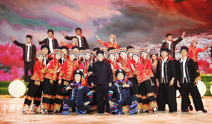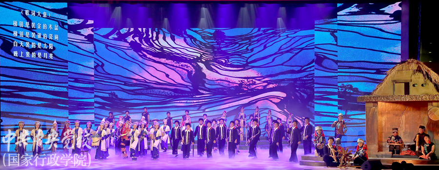 為深入學習貫徹習近平總書記關于弘揚中華優秀傳統文化的重要講話精神,傳承農耕文明、堅定文化自信,11月4日晚,云南省紅河哈尼族彝族自治州《哈尼古歌》在中央黨校(國家行政學院)北校區禮堂精彩上演。中央黨校(國家行政學院)分管日常工作的副校(院)長何毅亭,副校(院)長李季、謝春濤,云南省委常委、常務副省長宗國英,云南省人大常委會副主任、省總工會主席王樹芬,云南省委宣傳部副部長楊正權,云南省紅河哈尼族彝族自治州州委副書記、州人民政府州長羅萍等領導和嘉賓,以及校(院)各直屬單位負責同志、在校學員、教職工約1600人觀看了演出。