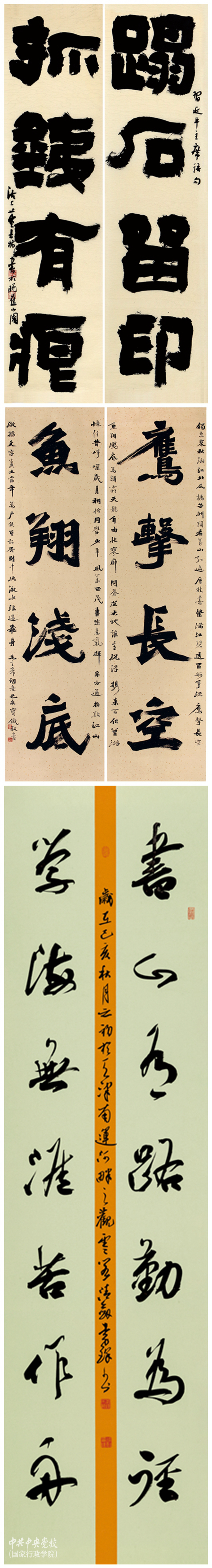 本次展覽共展出董士林、冉繁英、謝強、竇寶鐵、李鋒五位書法家的120余幅書法作品,內容包括習近平總書記的重要論斷、用典詞句,詩詞對聯,名言警句等,涵蓋楷、草、隸、篆、行等類型。這些作品或雄渾蒼勁,或細膩溫潤,或清雅秀媚,風格迥異、各有千秋,折射著藝術家們深厚的書法功底,傳遞著中華優秀傳統文化生生不息、薪火相傳的精神力量。