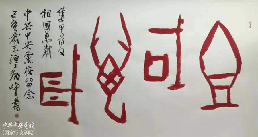 2019年是甲骨文發(fā)現(xiàn)120周年。習(xí)近平總書記指出,“甲骨文是迄今為止中國發(fā)現(xiàn)的年代最早的成熟文字系統(tǒng),是漢字的源頭和中華優(yōu)秀傳統(tǒng)文化的根脈,值得倍加珍視、更好傳承發(fā)展”。為貫徹落實(shí)習(xí)近平總書記重要指示精神,弘揚(yáng)中華優(yōu)秀傳統(tǒng)文化,2019年12月30日上午,《中華基因——紀(jì)念甲骨文發(fā)現(xiàn)120周年魏峰甲骨文書法藝術(shù)展》在中央黨校(國家行政學(xué)院)美育館隆重開展。開展式上,魏峰先生向校(院)捐贈(zèng)甲骨文書法作品《祖國萬歲》,北京工藝美術(shù)出版社捐贈(zèng)鈞瓷制品《中華基因鼎》,中央黨校(國家行政學(xué)院)副校(院)長李季為魏峰頒發(fā)收藏證書。校(院)圖書和文化館副館長劉俊瑞、中國國際文化傳播中心執(zhí)行主席龍宇翔、中央文史研究館書畫院執(zhí)行院長馬新林、河南安陽殷墟管理處主任王銀安先后致辭。校(院)圖書和文化館常務(wù)副館長謝煜桐宣布開展。