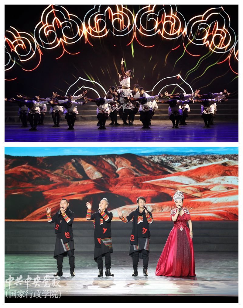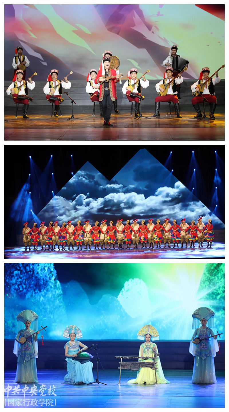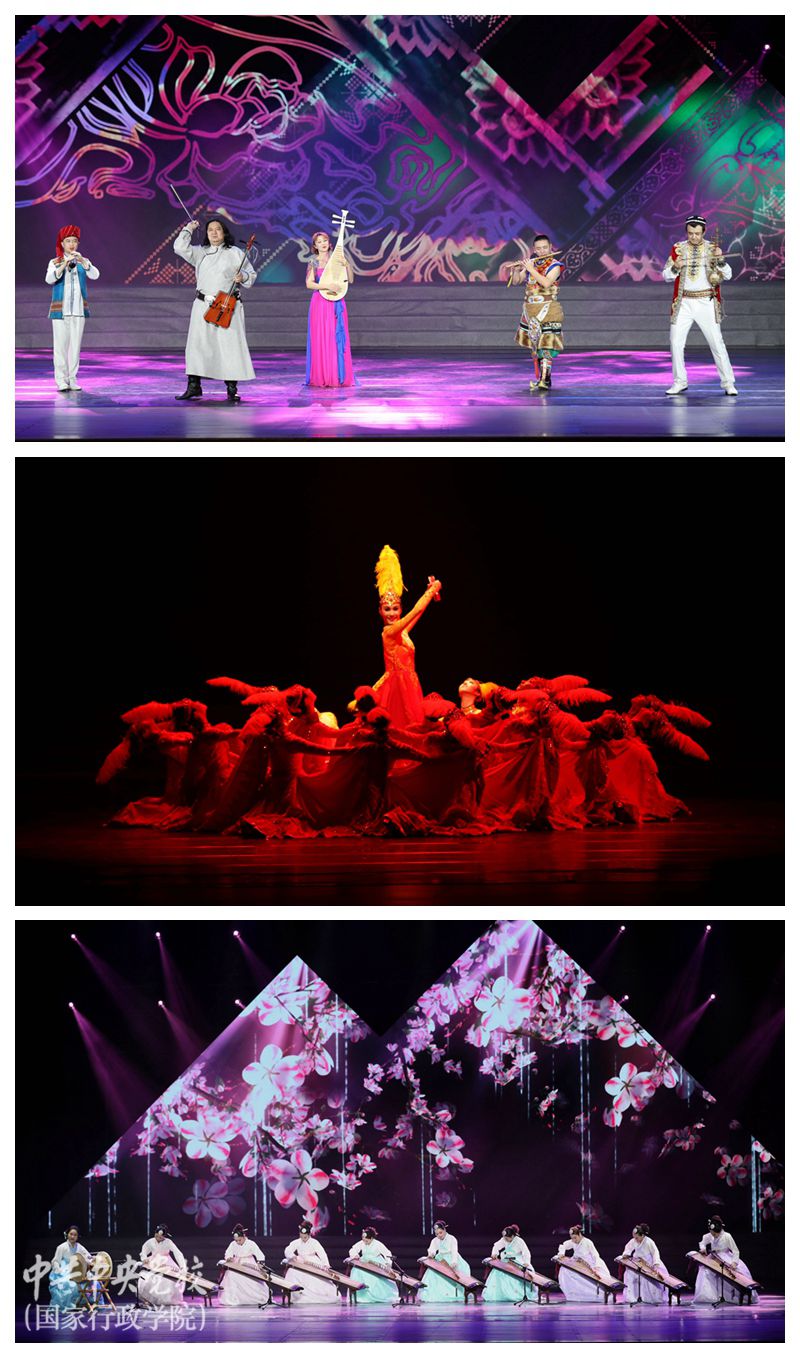 當晚演出在《我和我的祖國》豪邁激昂的歌聲中拉開帷幕,器樂組合《五色風情》、維吾爾族女子群舞《石榴紅了》、伽倻琴彈唱朝鮮族民謠《迎春謠》、藏族歌舞《山那邊》、哈尼族女子群舞《山谷廻響》、蒙古族男子群舞《駿馬歸來》、彝族歌曲《留客歌》等節目相繼上演。深情婉轉的歌聲、熱情奔放的舞蹈、意味濃郁的器樂、絢麗繽紛的服飾,令人目不暇接、嘆為觀止。尾聲歌舞《同心共筑中國夢》引發觀眾強烈共鳴,臺上臺下互動交融,將整臺晚會推向高潮。演出結束時,全場齊聲高唱《沒有共產黨就沒有新中國》,致敬偉大的中國共產黨,致敬偉大新時代。