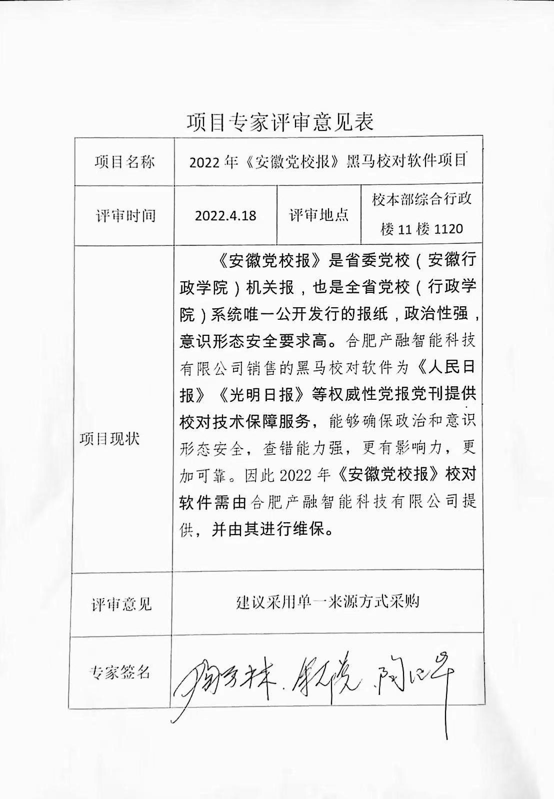 《安徽黨校報》是省委黨校(安徽行政學院)機關報,也是全省黨校(行政學院)系統唯一公開發行的報紙,政治性強,意識形態安全要求高。合肥產融智能科技有限公司銷售的黑馬校對軟件為《人民日報》《光明日報》等權威性黨報黨刊提供校對技術保障服務,能夠確保政治和意識形態安全,查錯能力強,更有影響力,更加可靠。因此2022年《安徽黨校報》校對軟件需由合肥產融智能科技有限公司提供,并由其進行維保。