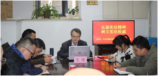 開展一次憲法宣傳講座。12月5日上午在蕪湖路街道蘭亭社區會議室,請法學教研部教授王軍為社區工作人員和居民做一次以《弘揚憲法精神樹立憲法權威》專題講座,積極宣傳人人學法、守法、用法的新風尚。