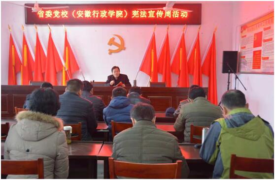 開展一次送憲法下鄉。12月6日,校領導丁毅帶領幫扶干部和法學教研部骨干教師赴我校定點幫扶村六安市裕安區青山鄉八字崗村,開展“送憲法下鄉,助力精準扶貧”活動,請法學教研部杜敏教授為村黨員干部和村民做一次《憲法修改的中國實踐》專題講座。幫扶干部深入貧困戶走訪慰問,贈送憲法讀本,宣傳憲法,營造遵紀守法、誠實守信的良好村風民風。