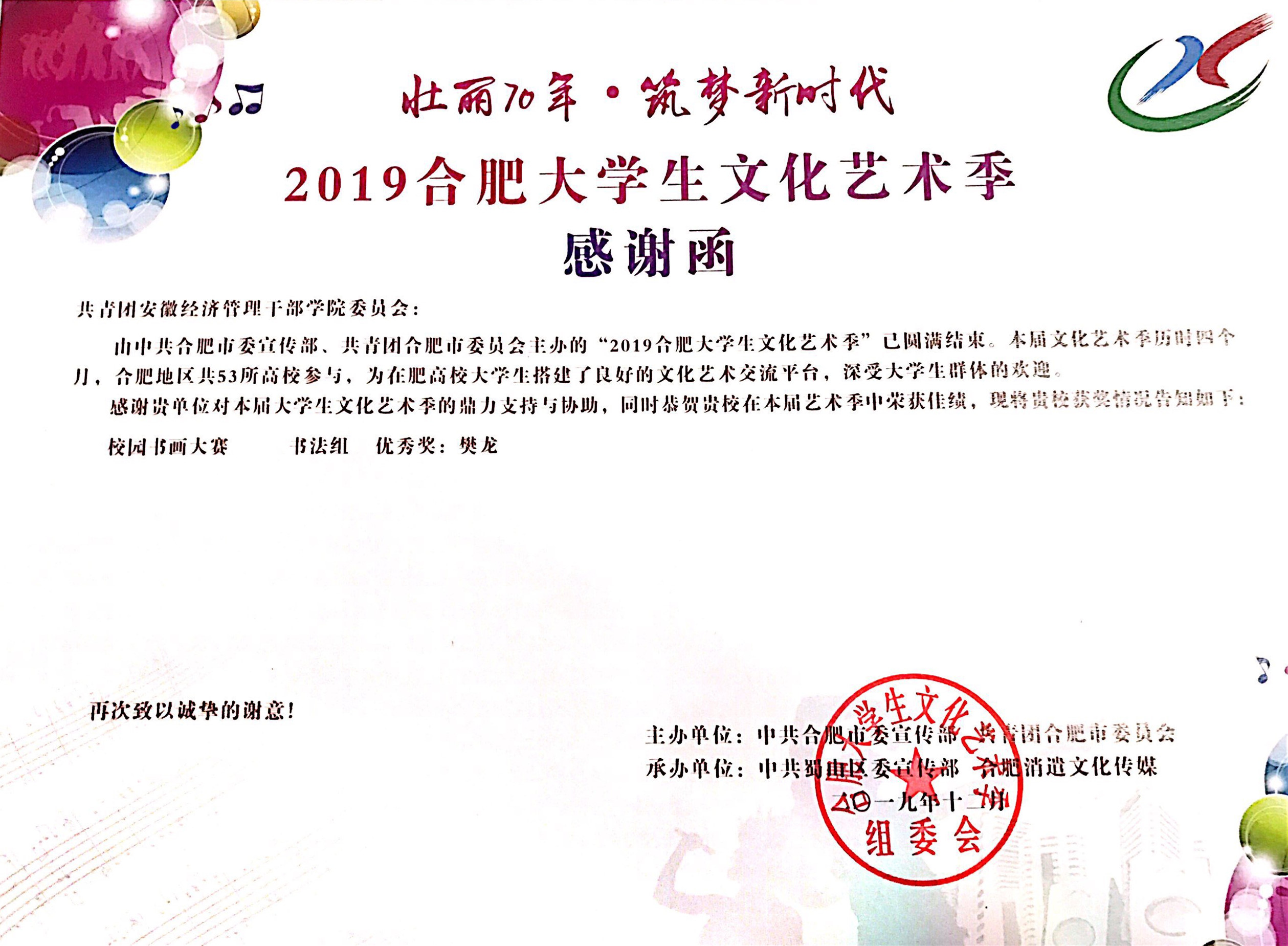 近日,由中共合肥市委宣傳部、共青團(tuán)合肥市委員會主辦的“壯麗70年·筑夢新時代”2019合肥大學(xué)生文化藝術(shù)季圓滿結(jié)束,安徽經(jīng)濟(jì)管理學(xué)院積極組織學(xué)生社團(tuán)積極參與,擇優(yōu)申報,由逸麟閣書畫協(xié)會樊龍同學(xué)撰寫的作品《修身座右銘》獲書法組優(yōu)秀獎。本屆文化藝術(shù)季歷時四個月,合肥地區(qū)共53所高校參與,為在肥高校大學(xué)生搭建了良好的文化藝術(shù)交流平臺,深受大學(xué)生群體的歡迎。