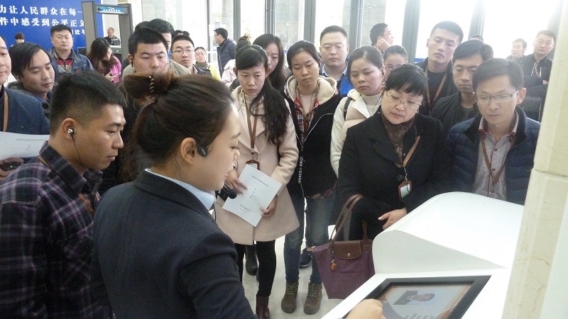 在法院訴訟服務(wù)中心講解員的引導(dǎo)下,大家參觀學(xué)習(xí)了該區(qū)近年來的司法體制建設(shè)項目,特別是同學(xué)們還親身體驗了該中心首創(chuàng)的“e調(diào)解”平臺,參與了線上直播庭審案件,感受到蜀山區(qū)在司法體制建設(shè)方面的確實實在在地發(fā)揮了社會參與、廣泛搭臺、多頻調(diào)解等機制的作用,體現(xiàn)了便民、利民的服務(wù)原則