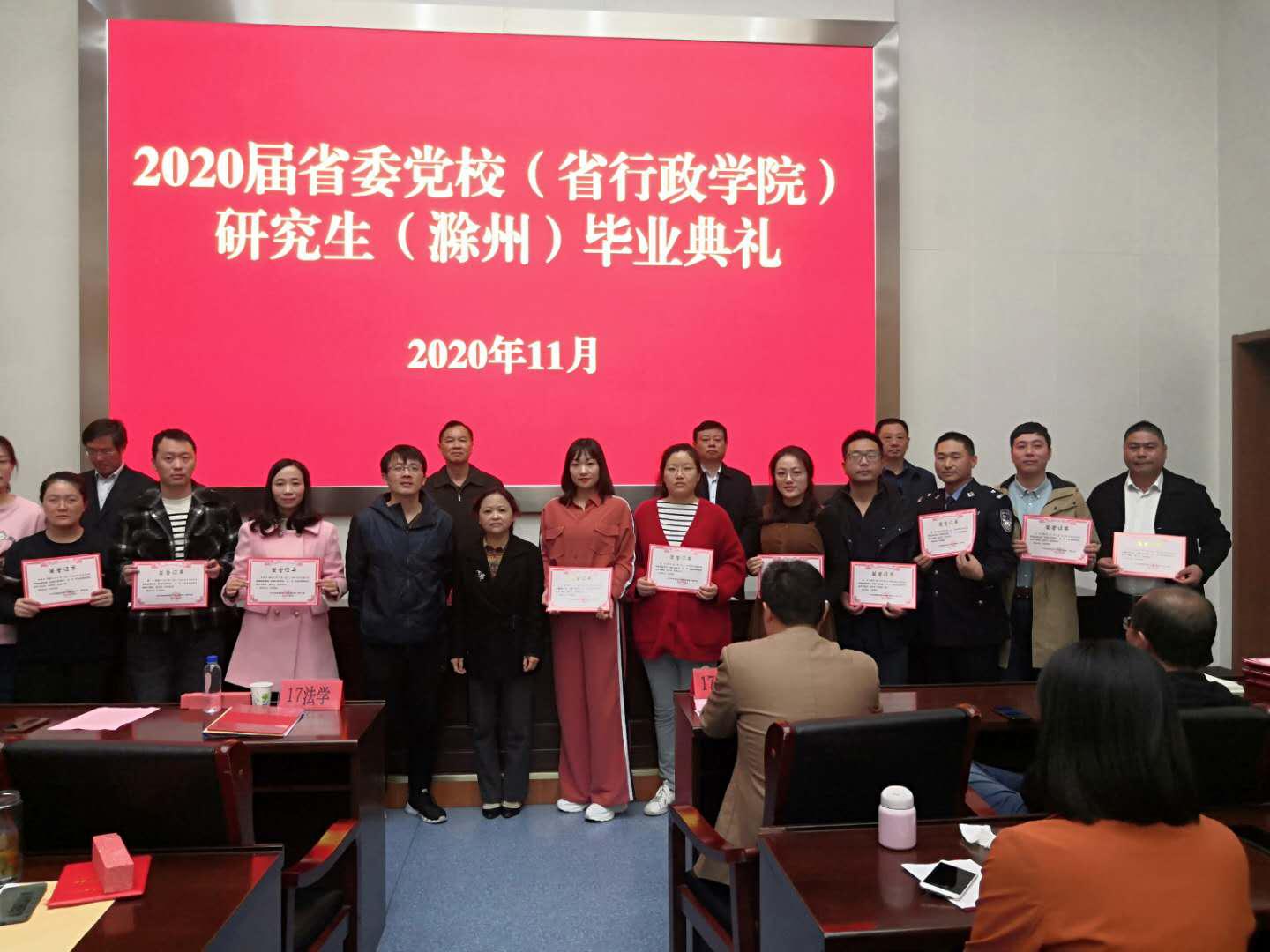 2020年11月7日上午,安徽省委黨校在職研究生滁州教學點2020屆研究生畢業典禮在市委黨校205報告廳舉行。滁州市委黨校(滁州市行政學院)常務副校長焦義朝、安徽省委黨校(安徽省行政學院)研究生部主任郭偉出席,2020屆法學和經管專業共140名學員參加畢業典禮。