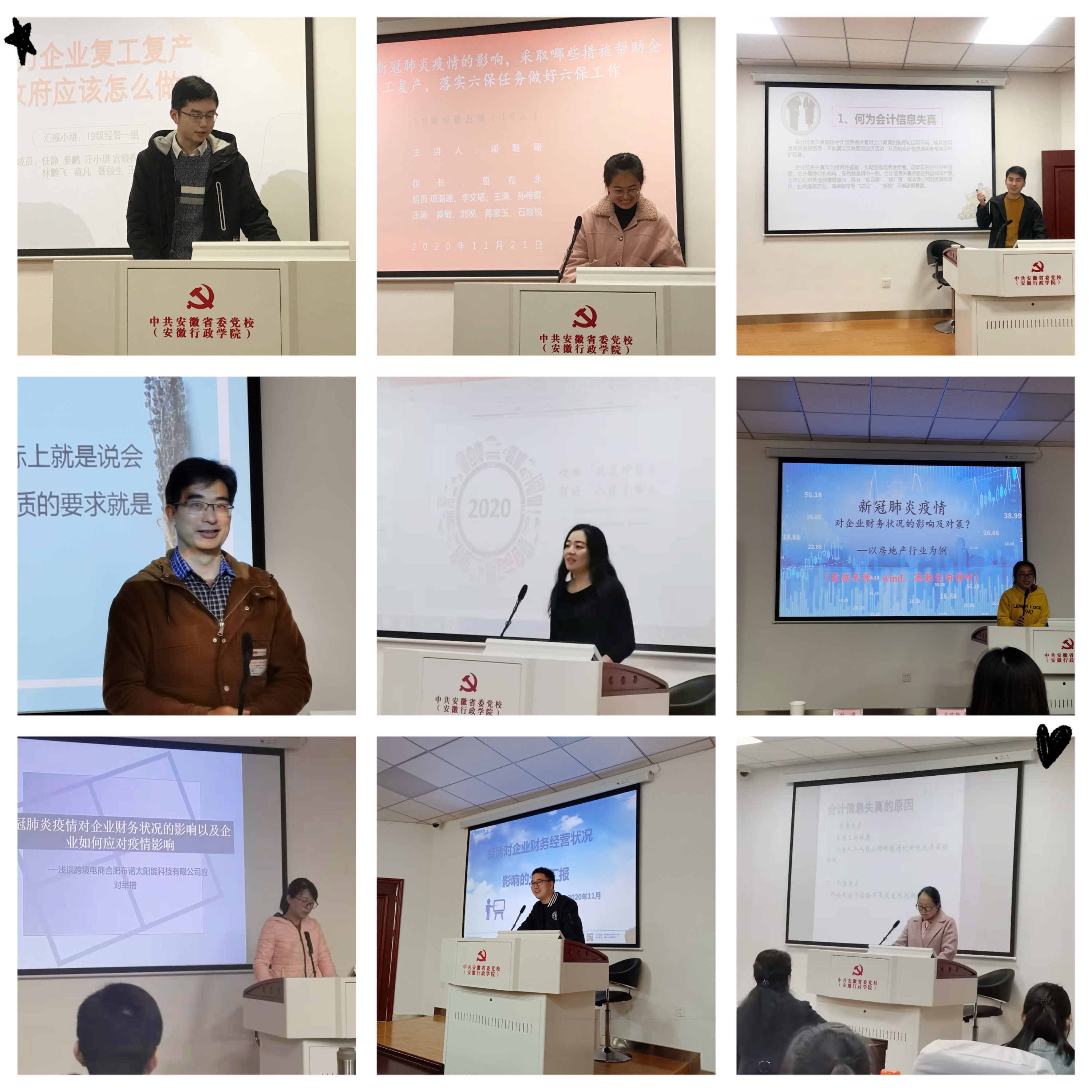 經過細致的調研和集體的探討,9個學習小組逐一上臺展示學習成果,現場演講與實時答疑同步開展,充分展現出同學們務實的學習精神、開闊的思維方式、跳躍的創新理念。例如,以實體企業藍鼎環保為例,闡述疫情對企業財務資金周轉、施工項目進展等帶來的影響和應對舉措;以合肥市國資委下屬國有企業為例,回顧疫情期間國企的“民生擔當”,以及“疫后花開”持續向小微企業“輸血”并加快水電氣熱公共交通等民生工程建設進度,讓民生長卷在六穩六保中步步生花;深挖企業會計信息失真可能存在的主觀和客觀因素,追根溯源防微杜漸等。各小組的展示亮點紛呈、現場答疑妙語連珠,博得滿堂彩。