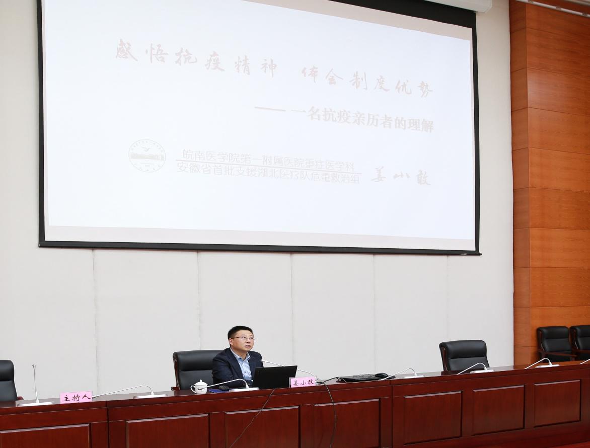 “人無精神則不立,國無精神則不強”,姜小敢醫生用樸實無華的言語深情回顧他的抗疫經歷,在武漢最危難時“沒有條件,創造條件也要上”;在武漢最需要時,“疫情不退,我們不退”;在武漢決戰時,“最難啃的硬骨頭都交給我們”,暢談他對“人民至上、生命至上,舉國同心、舍身忘死、尊重科學、命運與共”偉大抗疫精神的深刻理解和感悟。短短的報告會鼓舞人心、催人奮進,使全體學員受到了深刻的思想教育和極大的精神激勵。