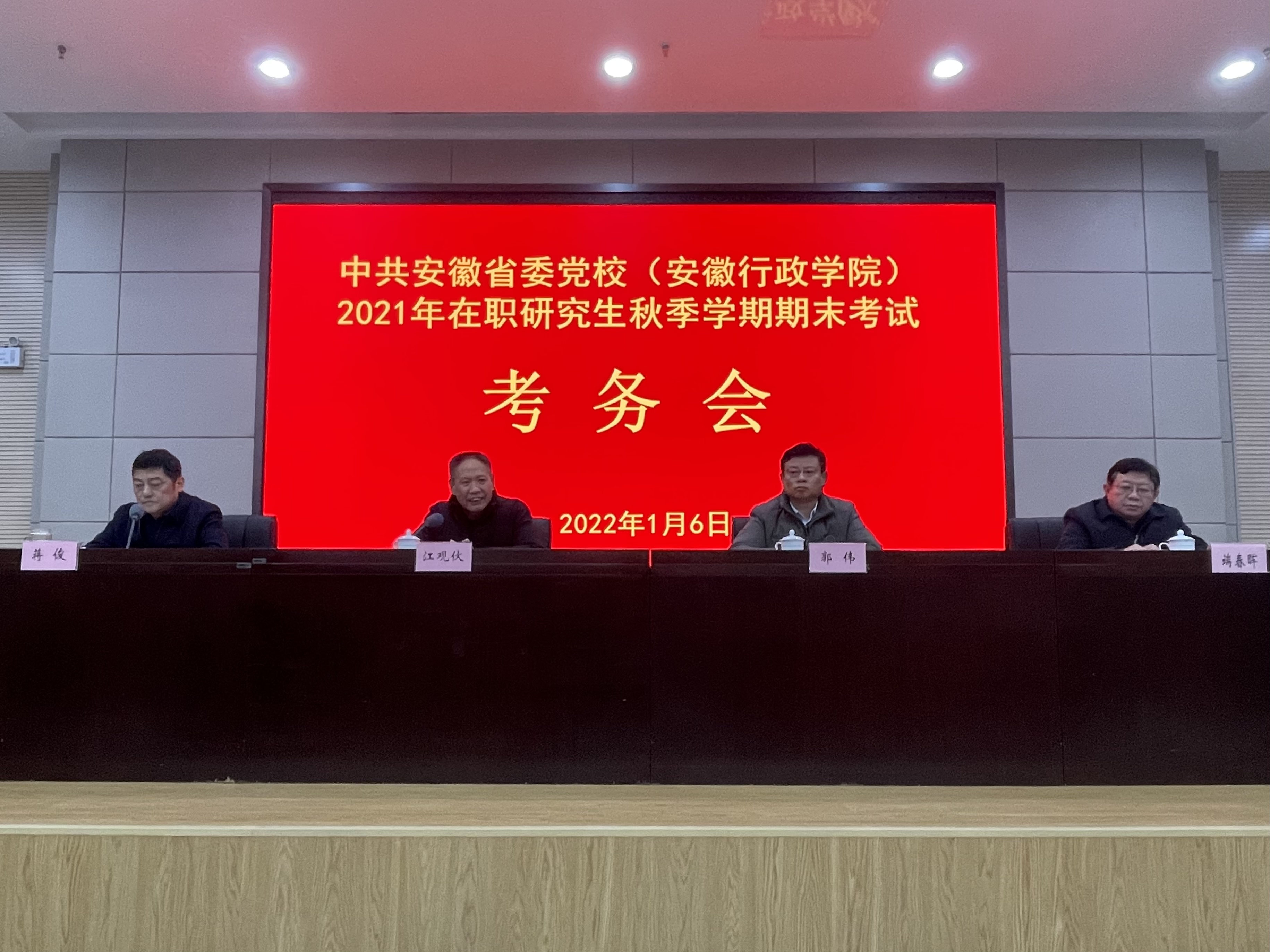 1月6日下午,省委黨校(安徽行政學院)召開2021年秋季學期期末考試考務會,副校(院)長江觀伙出席會議并講話,參加會議的有各教學點研辦負責同志、校(院)疫情防控人員、監考老師及研究生部全體人員。